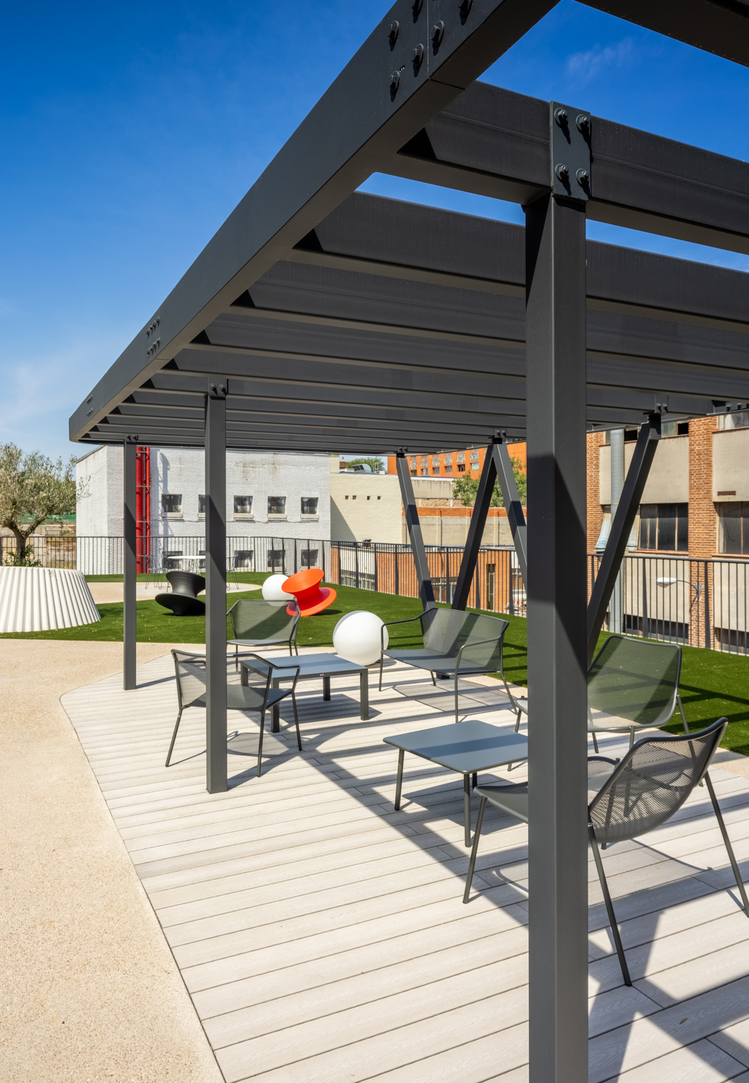 Máxima transparencia en fachada, plantas diáfanas y aprovechamiento de cubierta como espacio exterior ajardinado.